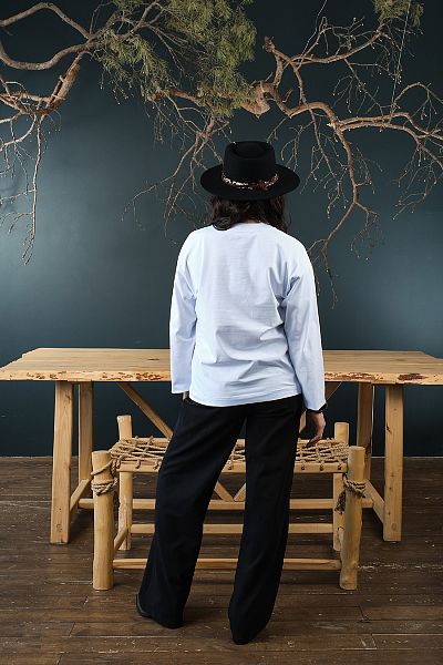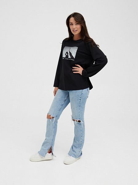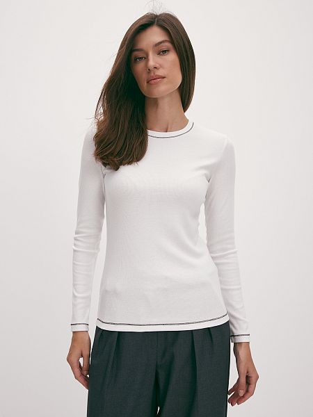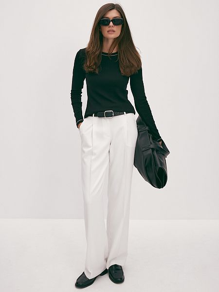 Классический комплект на все времена — футболка и джинсы. Лонгслив эффектно смотрится и в сочетании с брюками. Получается элегантный, сдержанный образ.